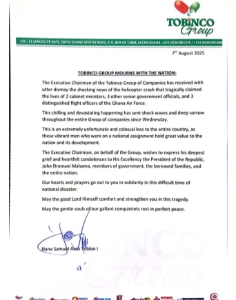 The Executive Chairman of the Tobinco Group of Companies has received with utter dismay the shocking news of the helicopter crash that tragically claimed the lives of two cabinet ministers, three other senior government officials and three distinguished flight officers of the Ghana Air Force.