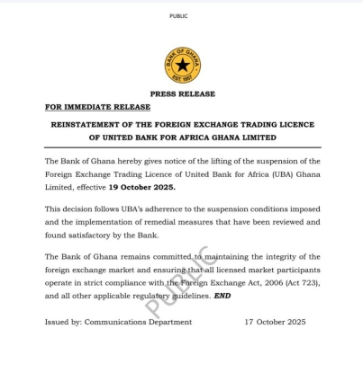 The Bank of Ghana has lifted the suspension of the Foreign Exchange Trading Licence of United Bank for Africa (UBA) Ghana Limited, effective October 19, 2025.