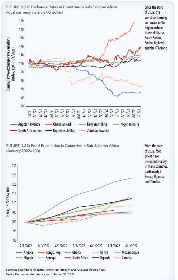 "In addition, an increasing food and fuel pass-through made a large contribution to inflation. Food prices have increased sharply in Kenya (21 basis points), Uganda (20 basis points), and Zambia (14 basis points) since the beginning of the year (figure 1.23). In turn inflation erodes the purchasing power of poor people, increases poverty, amplifies food insecurity, and widens inequality".