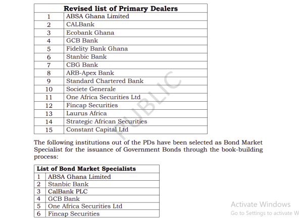 The approved Primary Dealers are ABSA Ghana Limited, CALBank, Ecobank Ghana, GCB Bank, Fidelity Bank Ghana, Stanbic Bank, CBG Bank, ARB-Apex Bank, Standard Chartered Bank, Societe Generale, One Africa Securities Ltd, Fincap Securities, Laurus Africa, Strategic African Securities and Constant Capital Ltd.
