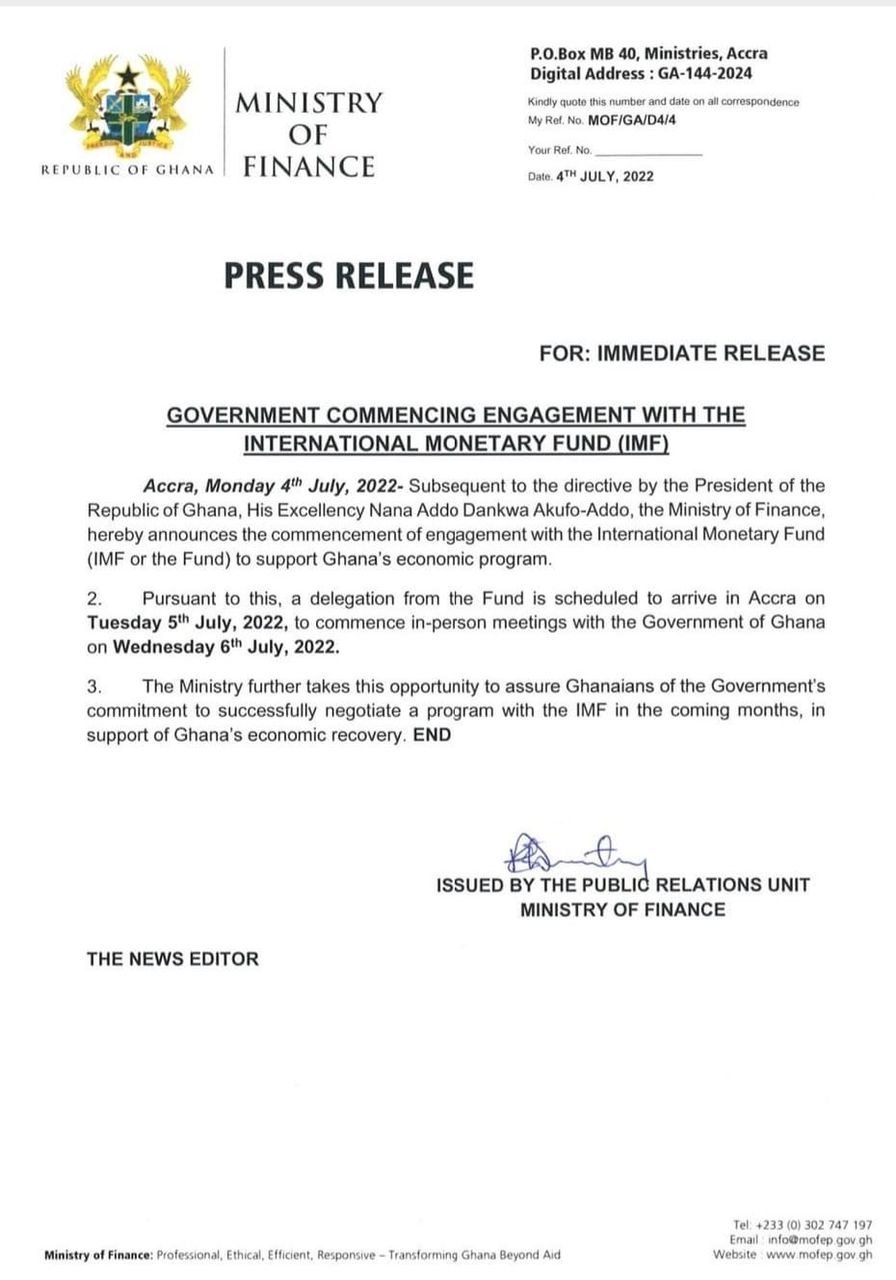 Last Thursday, June 30, 2022, Ghana indicated to the IMF its intention to seek Balance of Payment (BoP) support.