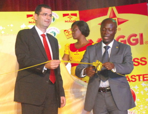 The Deputy Minister of Trade and Industry, Nii Lante Vanderpuije (right), being assisted by the Country Director of Nestle Ghana Limited, Mr El Moataz El Hout, to cut the tape to signify the relaunch of the new Maggi, an iron fortification product at a ceremony in Accra. According to Mr El Hout, maggi tablets are made with cassava starch and other foodstuffs such as vegetables, meat and fish.