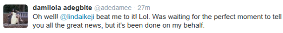 Damilola has now confirmed the news. Posting Monday on Twiiter, the beautiful actress said she had been waiting for the perfect moment to break the news.
