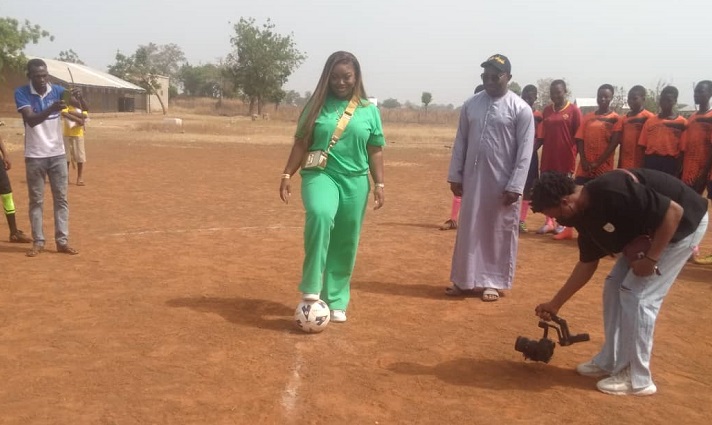 Jackie Appiah takes the first kick to start a football match played in her honour.