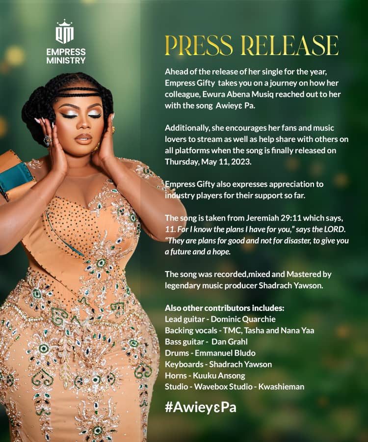 In the press release, Empress Gifty expressed her gratitude to industry players for their support and urged fans and music lovers to stream and share the song on all platforms. "Awieyε Pa" translates literally in Akan as great ending and is taken from Jeremiah 29:11, which reads: "For I know the plans I have for you," says the LORD. "They are plans for good and not for disaster, to give you a future and a hope."