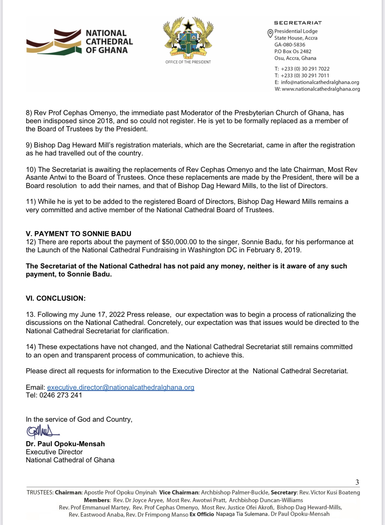 “The Secretariat of the National Cathedral has not paid any money, neither is it aware of any such payment, to Sonnie Badu,” a statement signed by Dr. Paul Opoku-Mensah, the Executive Director of the National Cathedral of Ghana dated June 21, 2022 said.