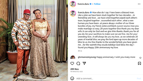 Veteran Nollywood actor Francis Duru has taken to Instagram to celebrate his 20th wedding anniversary with his wife.