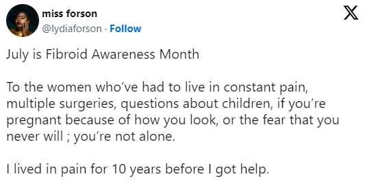 Her post resonated with many, as she vividly described the physical and emotional toll of living with fibroids. Forson expressed gratitude for her recovery and emphasized the importance of seeking medical help.
