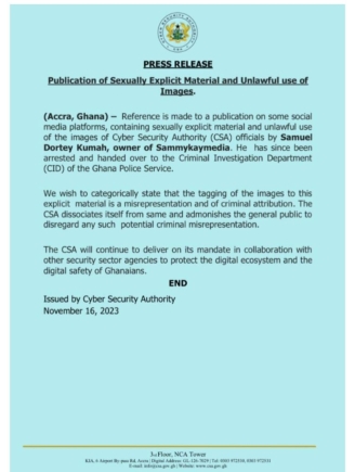 "Reference is made to a publication on some social media platforms, containing sexually explicit material and unlawful use of the images of Cyber Security Authority (CSA) officials by Samuel Dortey Kumah, owner of Sammykaymedia."