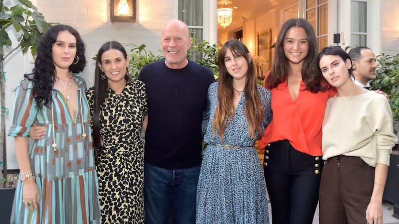 Willis celebrates the book launch of Demi Moore's memoir with their three daughters and his wife, Emma (second from right)