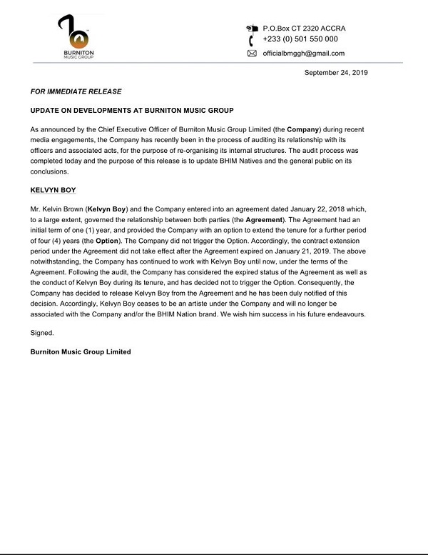 The company went further to state that, Kelvyn Boy has been released from the Agreement and for that reason will no longer be associated with the Bhimnation brand.