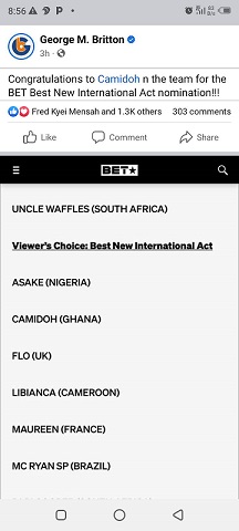 “Congratulations to Camidoh n the team for the BET Best New International Act nomination!!!”, he posted.