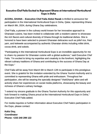 Executive Chef Faila Abdul Razak will represent Ghana in an International Horticultural Expo in Doha, Qatar on Saturday, March 9.