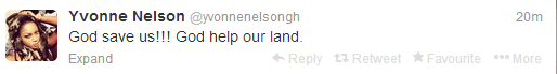 "God save us!!! Help our land", Yvonne, who has 182,700 followers on twitter, added.