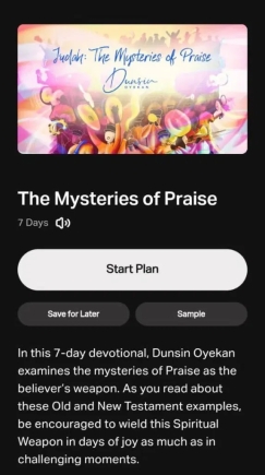 In a statement introducing the study plan, YouVersion highlighted its focus on the power of praise as a spiritual weapon: “In this 7-day devotional, Dunsin Oyekan examines the mysteries of Praise as the believer’s weapon. Through Old and New Testament examples, be encouraged to wield this spiritual weapon in both joyful and challenging moments. We would like to thank Integrity Music for providing this plan.”