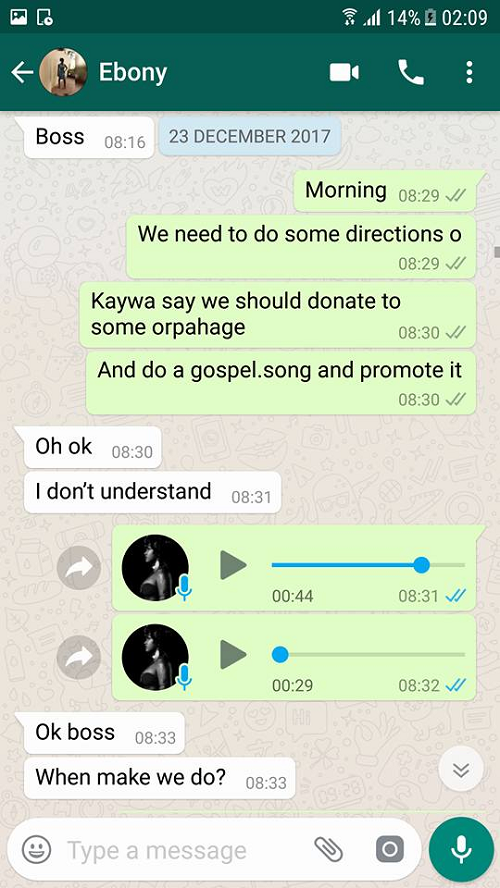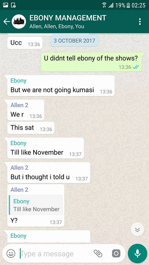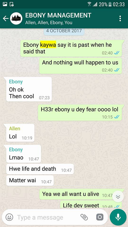 But Ebony’s manager, Ricky Nana Agyemang, aka Bullet, has published on Facebook a WhatsApp conversation between him (Bullet), Ebony and other management members of their team concerning one of the said prophesies about Ebony’s accident.