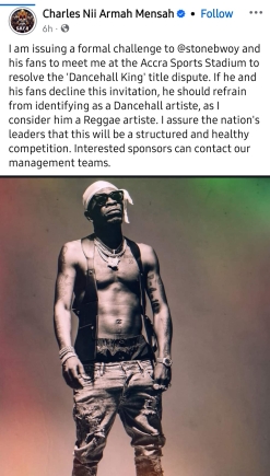 In a Facebook post, Shatta Wale stated: "I am issuing a formal challenge to @stonebwoy and his fans to meet me at the Accra Sports Stadium to resolve the 'Dancehall King' title dispute. If he and his fans decline this invitation, he should refrain from identifying as a Dancehall artiste, as I consider him a Reggae artiste. I assure the nation's leaders that this will be a structured and healthy competition. Interested sponsors can contact our management teams."