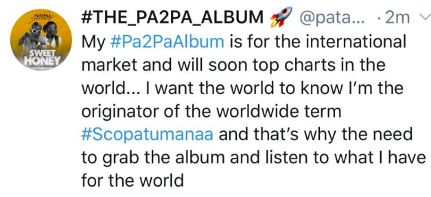 Patapaa tweeted: "My #Pa2PaAlbum is for the international market and will soon top charts in the world... I want the world to know I'm the originator of the worldwide term #Scopatumanaa and that's why the need to grab the album and listen to what I have for the world".