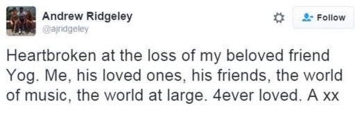 Writing on Twitter and referring to Michael by his family nickname of "Yog", he added: "Me, his loved ones, his friends, the world of music, the world at large. 4ever loved. A xx"