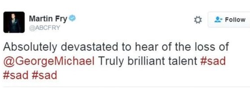 ABC's Martin Fry said: "Absolutely devastated to hear of the loss of @GeorgeMichael Truly brilliant talent #sad #sad #sad."