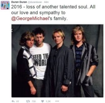 Duran Duran referred to the the so-called curse of 2016 - following the deaths of David Bowie, Prince and Rick Parfitt - posting on their official Twitter account: "2016 - loss of another talented soul. All our love and sympathy to @GeorgeMichael's family."