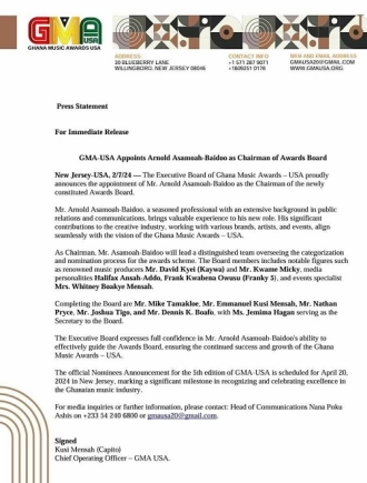 The Executive Council of the Ghana Music Awards –USA has named Entertainment analyst, Arnold Asamoah-Baidoo as the Chairman of its new Board of the fifth edition of the awards.