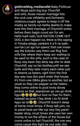 A part of Gistlover’s report reads, “Baby Politican and Abuja semi big boy, Churchill and wife, Rosie meurer marriage hits the rock over infidelity and Domestic violence,couple agrees to keep it off the media as family run helita skelita to make sure this third marriage of Churchill works before them begin count am for am.