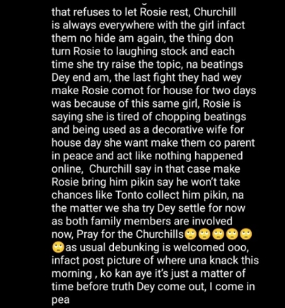 “Churchill doesn’t sleep at home most times, if Rosy talk pim, na to panel beat am like car wey Dey panel beater shop, most times she uses her own money to run the affairs of the house but come online to hail Churchill, the one wey come cause this fight be one side chic that refuses to let Rosie rest, Churchil is always everywhere with the girl infact them no hide am again, the thing don turn Rosie to laughing stock and each time she try raise the topic, na beatings Dey end am, the last fight they had wey make Rosie comot for house for two days was because of this same girl, Rosie is saying she is tired of chopping beatings and being used asa decorative wife for house day she want make them co parent in peace and act like nothing happened online,