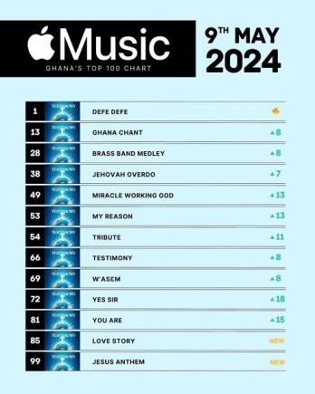As of May 9, 2024 ‘Defe Defe’ still tops the chart. Thirteen songs out of the 14 track ‘Testimony’ are on the Apple Music Top 100 chart in Ghana.