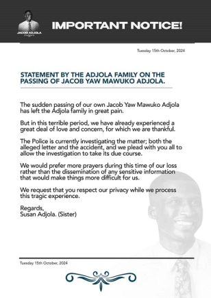 However, in a statement by the family signed by Susan Adjola, the deceased’s sister, today, it mentioned that the police was investigating the death and pleaded with the public not to impede the investigations with unsolicited information.