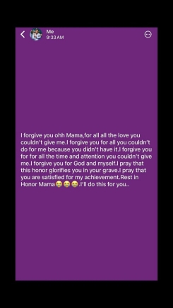 I forgive you for all the time and attention you couldn’t give me. I forgive you for God and myself. I pray that this honour glorifies you in your grave. I pray that you are satisfied for my achievement. Rest In Honour Mama. I’ll do this for you,” she posted.