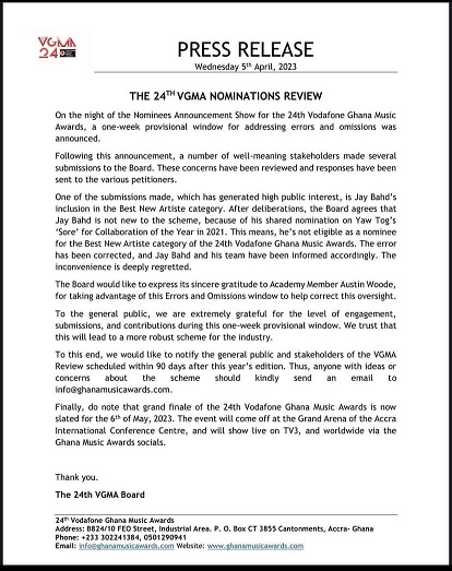“One of the submissions made, which has generated high public interest, is Jay Bahd’s inclusion in the Best New Artiste category. After deliberations, the Board agrees that Jay Bahd is not new to the scheme because of his shared nomination on Yaw Tog’s ‘Sore’ for Collaboration of the Year in 2021.