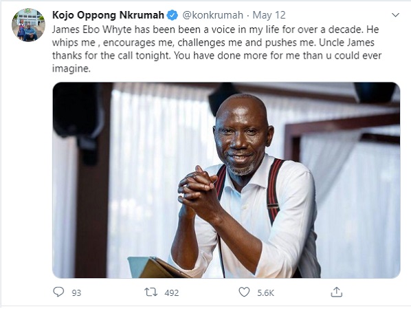 In a tweet he posted on May 12, 2020, Kojo Oppomg Nkrumah said, “James Ebo Whyte has been been a voice in my life for over a decade.”