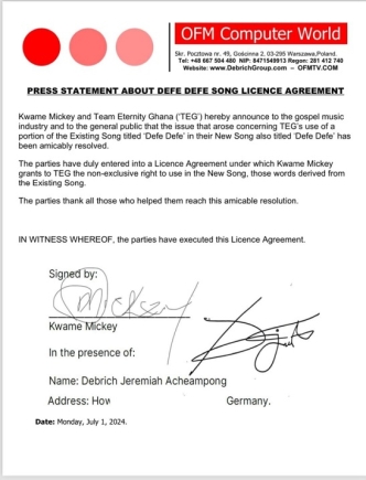 “The parties have duly entered into a Licence Agreement under which Kwame Mickey grants to Team Eternity Ghana the non-executive right to use in the new song, those words derived from the existing song,” part of the statement reads.