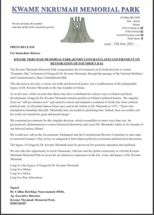 The Kwame Nkrumah Memorial Park has commended the government's decision to reinstate Founder's Day on September 21, honouring the legacy of Ghana's founding leader, Osagyefo Dr. Kwame Nkrumah.