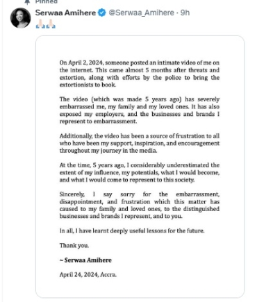 In the statement issued and shared across her social media account on Wednesday evening, April 24, 2024, Serwaa apologized for the embarrassment the incident has caused her family, employers, loved ones, and the businesses and brands she represents.