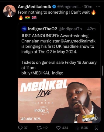 Reposting the official announcement of the concert by Indigo at the 02 on his X handle earlier today, Medikal wrote, “From nothing to something, Can’t wait”