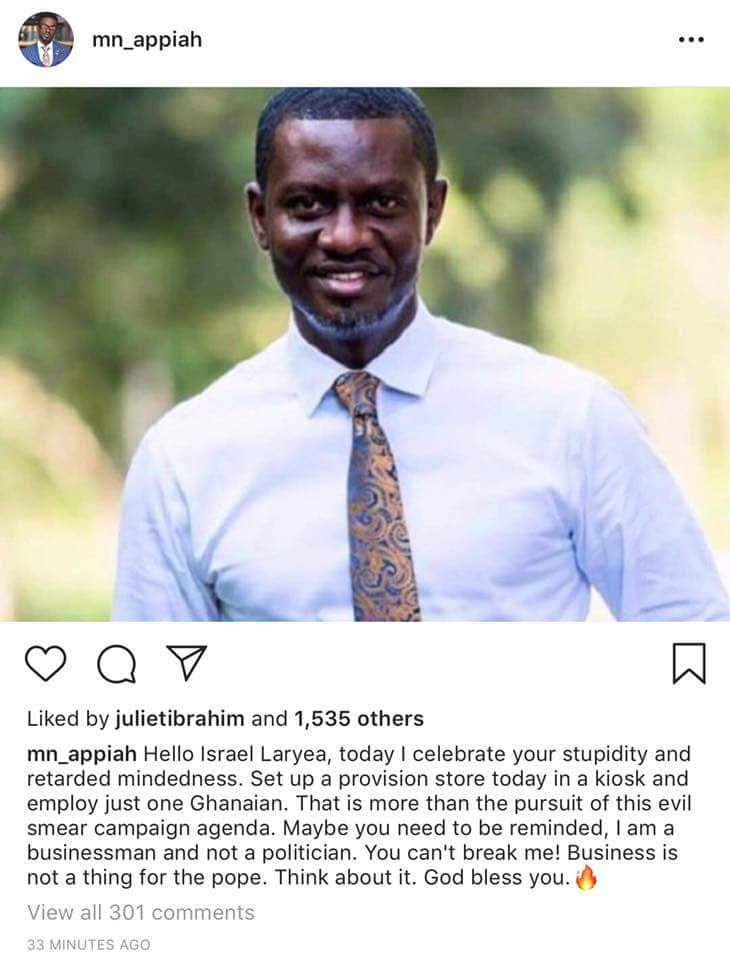 Nana Appiah Mensah, popularly called NAM 1 in an Instagram post accused Mr Laryea of embarking on a smear campaign against him following a report by the latter suggesting that the UK branch of the gold dealership company was non-existent.