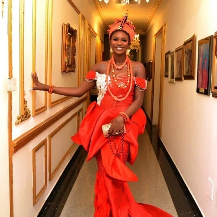 Natasha Osawaru dazzled in a red off-shoulder gown, crowned with a striking coral bead okuku headpiece—a symbol of Edo royalty. Her look was further enhanced by multiple layers of coral beads cascading from her neck, shoulders, and wrists, showcasing a vivid celebration of cultural heritage.