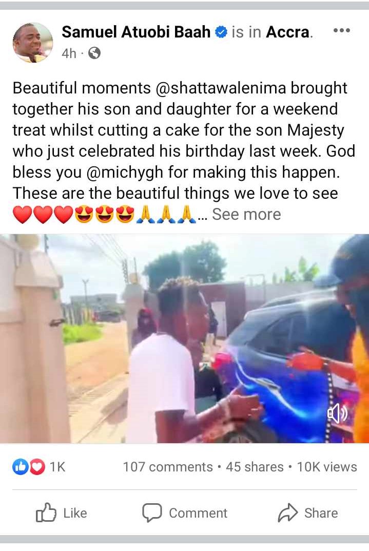 “Beautiful moments @shattawalenima brought together his son and daughter for a weekend treat whilst cutting a cake for the son Majesty who just celebrated his birthday last week. God bless you @michygh for making this happen. These are the beautiful things we love to see ❤️❤️❤️😍😍😍🙏🙏🙏,” he posted on Facebook.