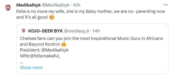 In his tweet, Medikal stated, "Fella is no longer my wife; she is the mother of my child. We are now co-parenting, and everything is going well."