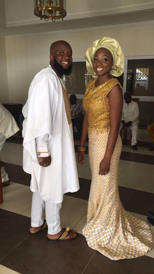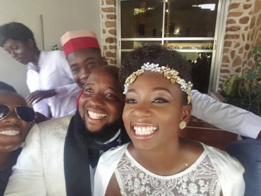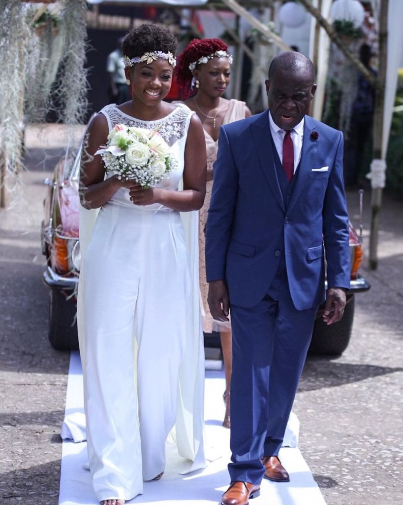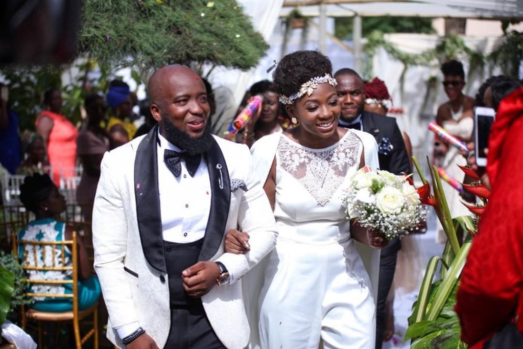 The bride sported a white jumpsuit with a cape, nude lipstick, simple earrings and a floral band as accessories while the 2011 Ghana Music Award Rapper of the Year wore a black shawl lapel tuxedo for their vows.