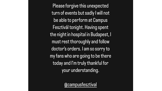 She said in an Instagram Story message to her 16 million followers that she would not be performing at Campus Fesztival in Debrecen, Hungary, on Saturday evening.