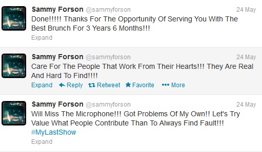 The reports have arisen from tweets he made on Friday, May 24 which read: “Done!!!!! Thanks For The Opportunity Of Serving You With The Best Brunch For 3 Years 6 Months!!!” and that it was going to be his last show.