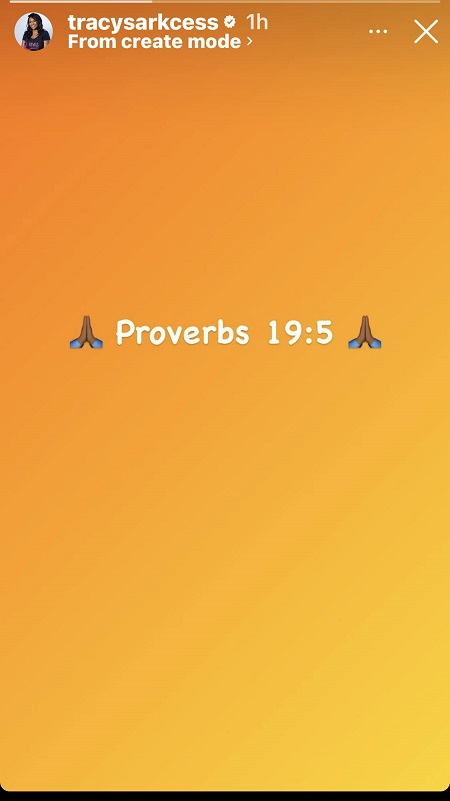 In an Insta-story post on Thursday, June 29, Tracy shared a bible verse, Proverbs 19:5 which reads;