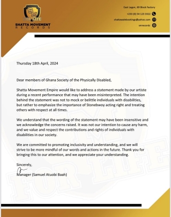 A letter addressed to the GSPD, signed by Shatta Wale’s manager Samuel Atuobi Baah, said the ‘Melisa’ hitmaker had no intention of making fun of or belittling persons with disabilities.