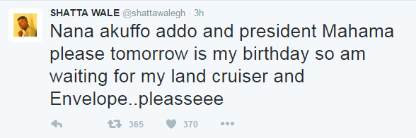 The self-proclaimed Dancehall King tweeted: “Nana akuffo addo and president Mahama please tomorrow is my birthday so am waiting for my land cruiser and Envelope..pleasseee”