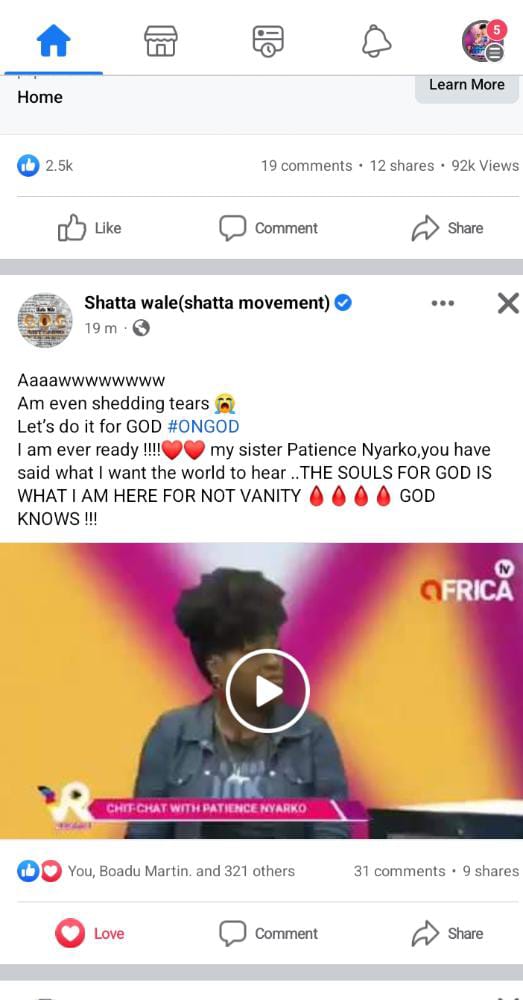Shatta Wale posted on his Facebook page yesterday saying "Aaaaaaaaaawwww, I am even shedding tears. Let’s do this for God. I am ever ready my sister Patience Nyarko. You have said what I want to hear. The souls for God is what I am here for not vanity and God knows."