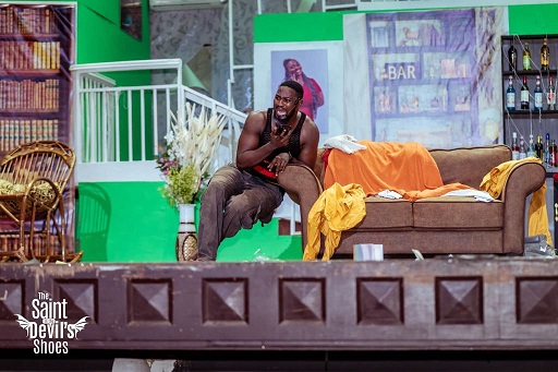 Bern Khobby played Sika Blankson, a man who shares his struggles with debt, a failed marriage, and personal loss while hiding from debt collectors in a house that once belonged to a deceased classmate in the ‘Saints in the Devil’s Shoes’, a one-man musical stage play written by Kobina Ansah and produced by Scribe Productions.