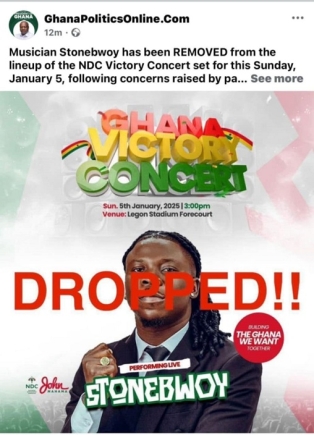 In a surprise move, Ghanaian dancehall artiste Stonebwoy has been removed from the lineup of artistes to perform at the National Democratic Congress (NDC) victory concert, slated to take place at the forecourt of Legon Stadium in Accra on Sunday, January 5.